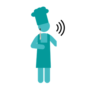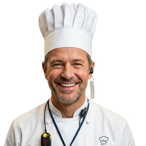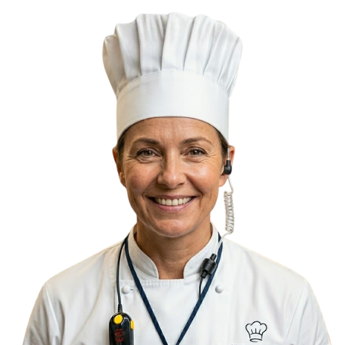 Dzięki słuchawkom Voicer kucharze słyszą się wyraźnie mimo hałasu okapów i maszyn, odpowiadając na komunikaty jednym przyciskiem.